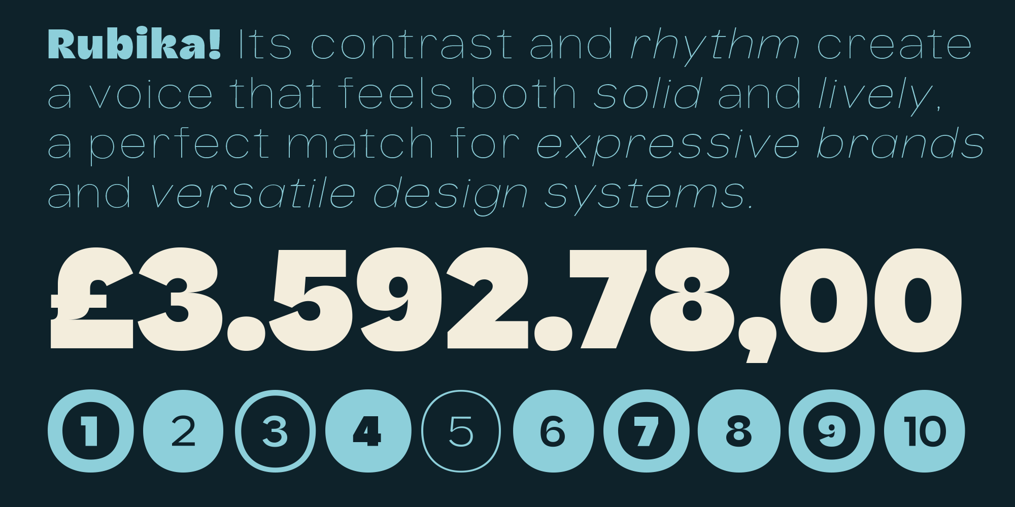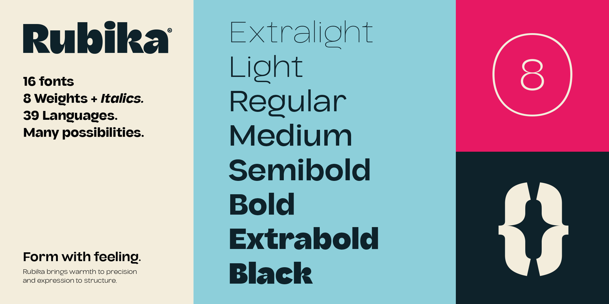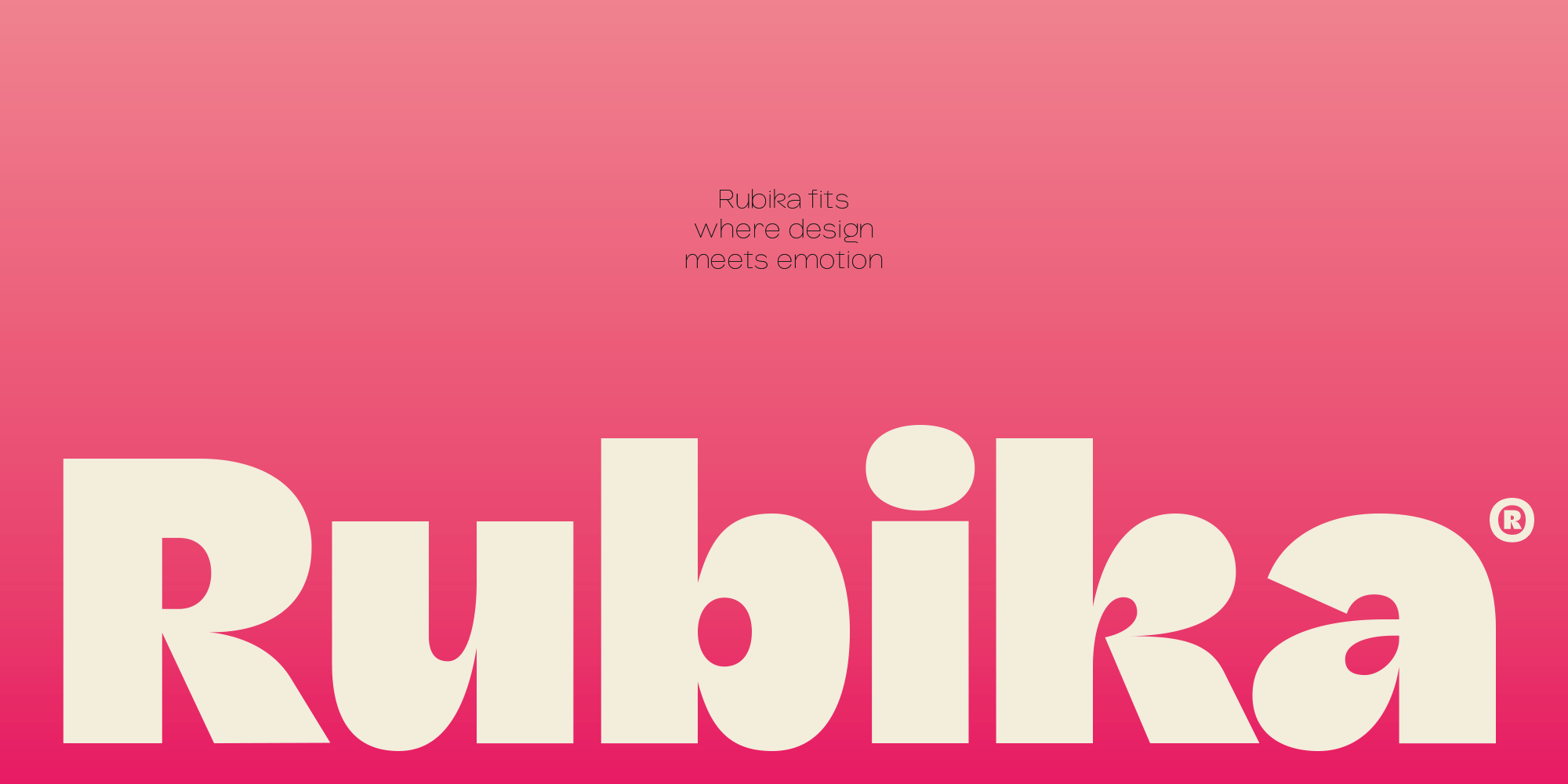 Rubika is a neo-grotesque sans typeface with a distinctive personality: it blends organic shapes, sharp contrasts, and a friendly, expressive attitude. Its design conveys warmth and dynamism without sacrificing legibility or structural solidity.